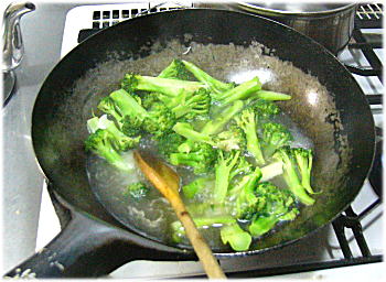 2)中華なべに、にんにくとごま油を熱し、ブロッコリーを入れます。